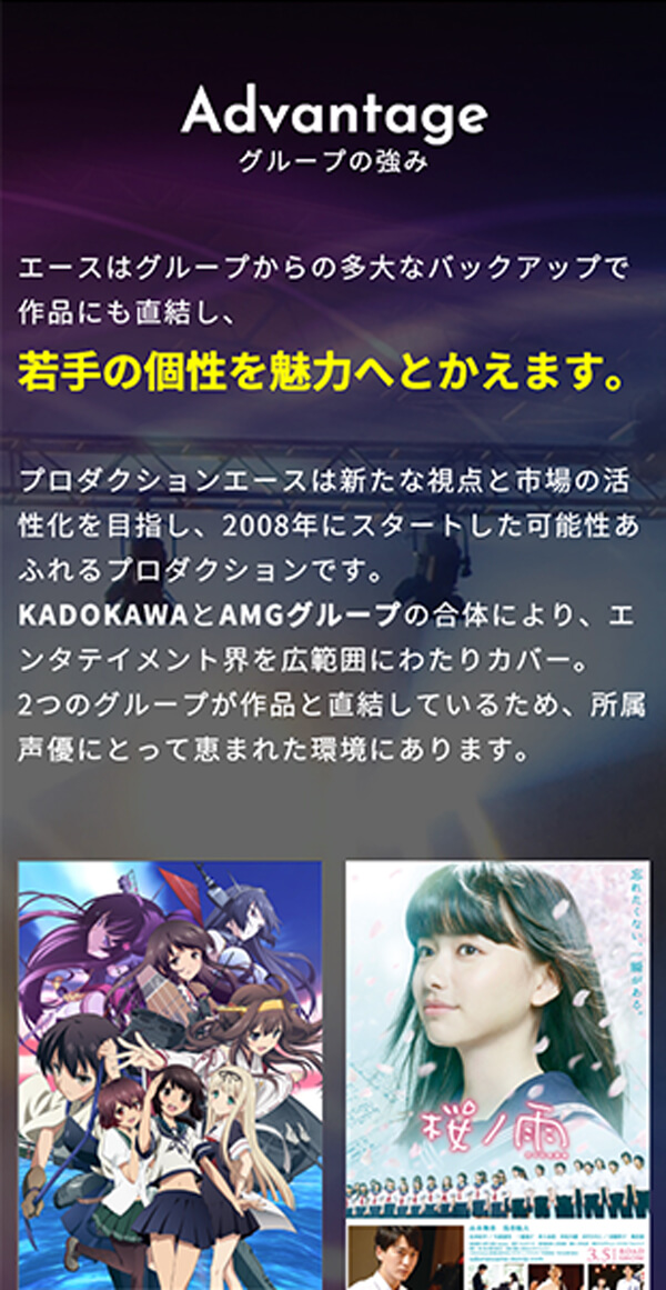 TOPページのスライダーの並々は声を発生した時の波形をイメージし、ターゲットが夢を追いかける10〜20代であるため、ビタミンカラーをポイントに使用しフレッシュなイメージでデザインしました。